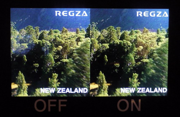 「CELLレグザ ブロックノイズクリア」のデモ。モスキートノイズ軽減効果が大きい