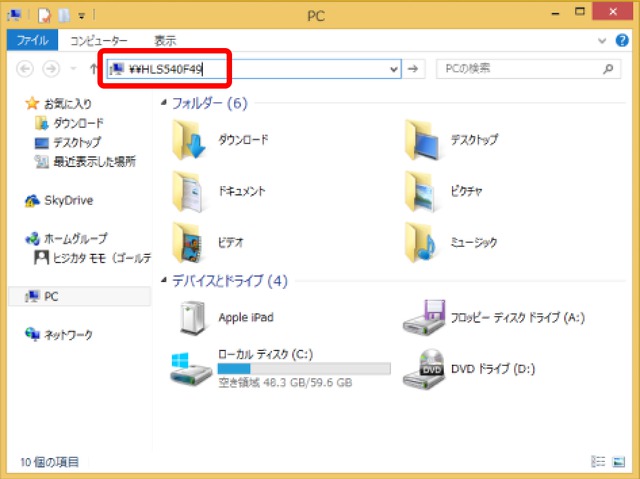 【2】エスクプローラーウインドーにメモしたデバイス名(smb://hls-xxxxx/)、もしくはIPアドレス(smb://192.168.xx.xx/)を入力してEnterキーを押す