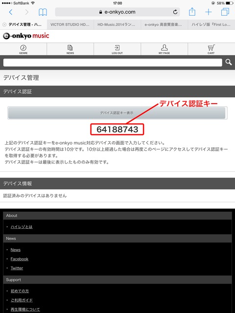 【4】デバイス認証キーが表示されるので、メモをとっておく
