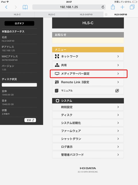 【5】管理画面からメディアサーバー設定をクリック