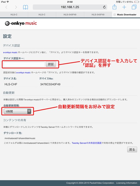 【9】メモをしたデバイス認証キーを入れ「認証」をクリック(必要ならば同画面上にある自動更新間隔を変更する)