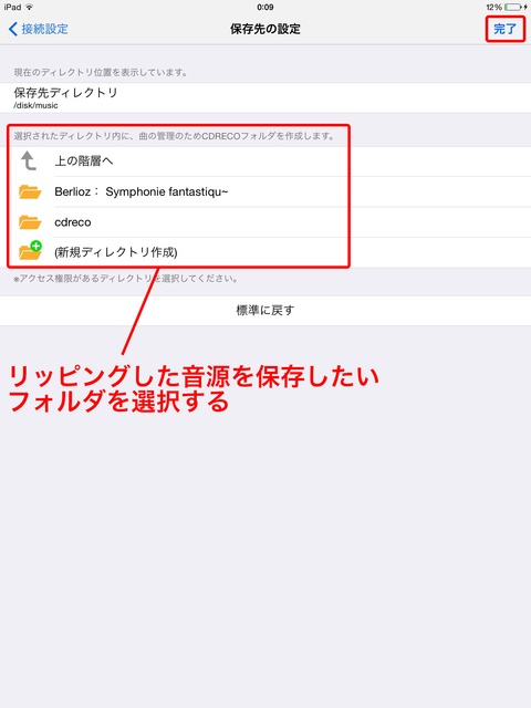 【4】保存先として「musicフォルダ」を指定して、右上の「完了」を押す。「登録ボタン」を押して変更を確定