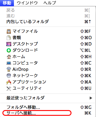 【2】画面上部メニューの「移動」→「サーバへ接続」をクリック