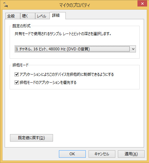 プロパティから「詳細」タブを選び、48kHz/16bitにセット