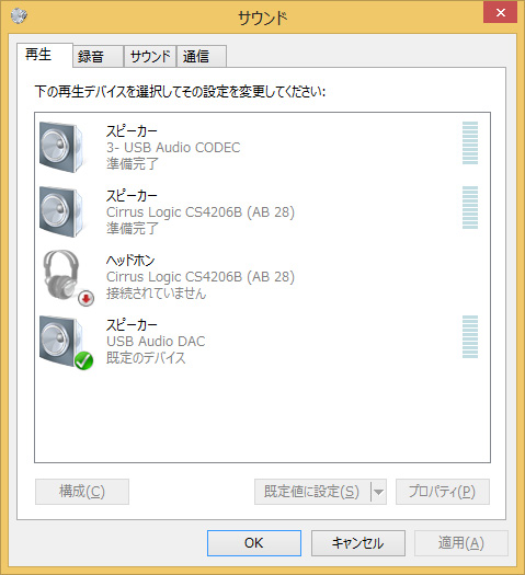 Windows 8のコントロールパネルから「サウンド」設定を開いたところ
