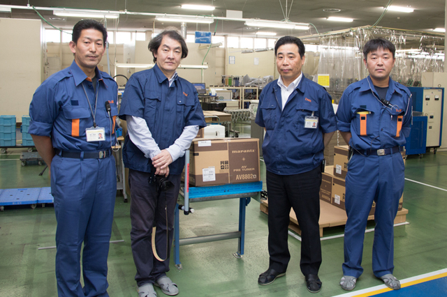 製造工程見学を終えての1枚。白河工場の増子敏美氏(写真左)、田辺秀一氏(写真中央右)、須藤隆氏(写真右)と、山之内氏(写真中央左)。中央のAV8802Aは記念すべき製品番号「1」。ちょうどこの日から、AV8802Aの製造が開始されていたのだ