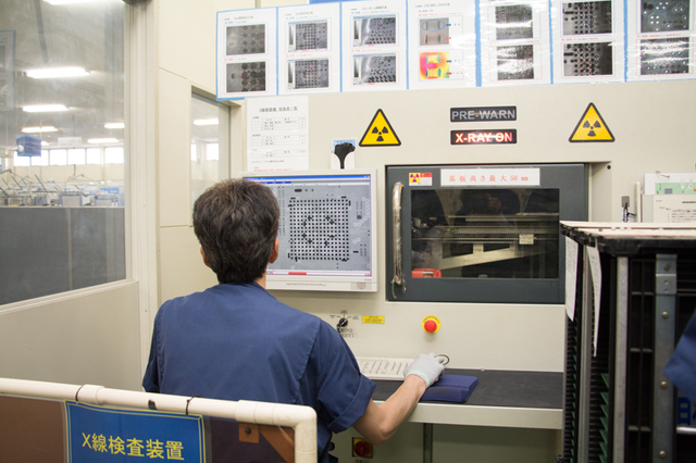 マシンによる工程で出来上がった各基板は、正確な部品実装や半田付けができているかひとつひとつX線検査で確認。問題があることはごく希だが、ここでしか発見できない不具合もあるため入念なチェックが行われるという