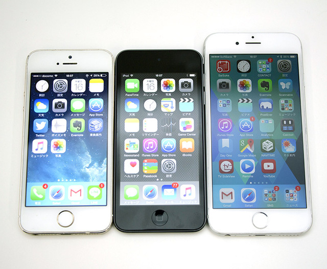 サイズ比較。左からiPhone 5s、新iPod touch、iPhone 6