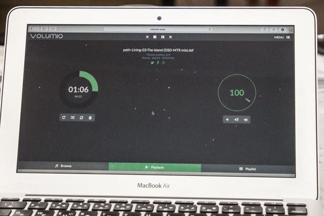 曲の再生指示にはPC/スマートフォンのWEBブラウザを利用できる。ここでは、テザリング中のiPhoneを経由し、MacBook Airからワイヤレスでラズパイ・オーディオを操作している