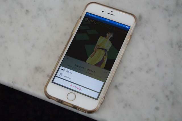 Apple Musicの音を、AirPlayで「ラズパイ・オーディオ」へ送信しているところ。画面下部に「volumio」(ラズパイ・オーディオのホスト名)が見える