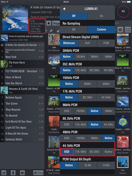 44.1kHz/16bitのPCMをDSD変換再生した際の画面。左上の赤枠内の表示で、DSD変換が確認できる