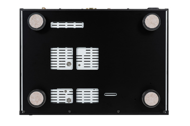 BDP-105DJPLの底面部。後述するボトムフレームの追加やインシュレーターの換装が見てとれる