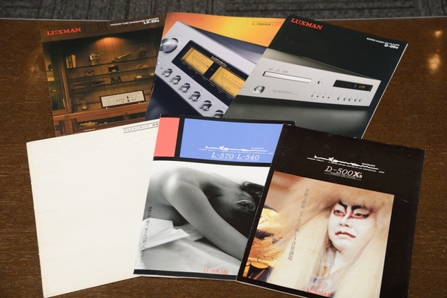 ラックスマンの新旧製品のカタログ。手前の過去製品のカタログからは、時代が感じさせられる、手前右が本文中で言及されているD-500X’sのカタログ