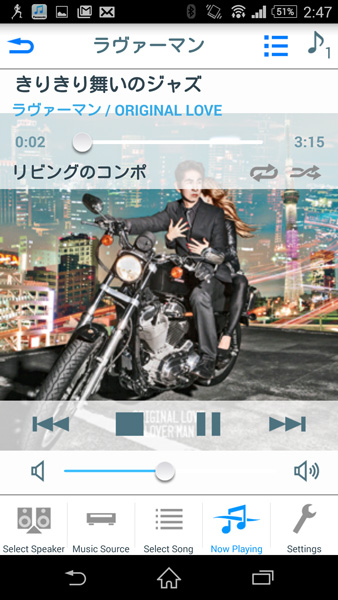 楽曲の再生画面。ジャケット写真の表示や基本的な再生操作ができる