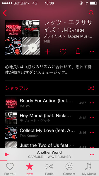 「フィットネス/エクササイズ」の中のプレイリスト。エクササイズの進捗に合わせてアップテンポな曲から始まり、最後はクールな曲で締まるような選曲が心憎い