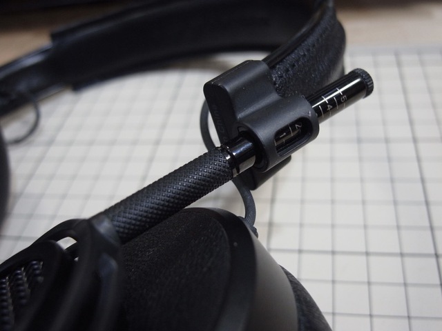 MH40|イヤーカップ位置調整機構。シャフト1本でヘッドバンドとハウジングの支持と長さ調整を兼ねるが、ステンレス製なので強度的な不安は感じさせない