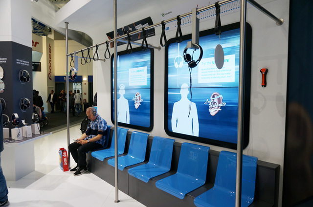 ブース内に電車の中を想定したセットをつくり、実際の利用シーンを想像しやすい環境で製品を試すことができるユニークな試みも