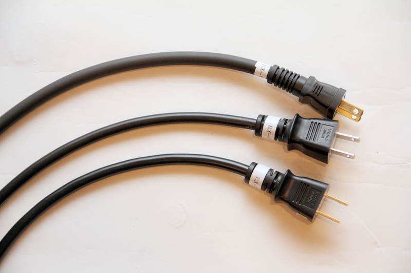 上からRX-V3067、RX-V2067、RX-V1067のケーブル。太さが違うほか、プラグ部のメッキも違うことがわかる