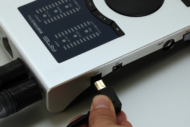 USB入力とXLR出力にケーブルを挿入する、オーディオ製品として各端子の剛性感は非常に高く好感を持った