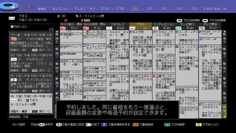 番組表は1画面のなかに7ch表示と予約リストを一体化したデザインで、予約が完了したことが見た目にも分かりやすい