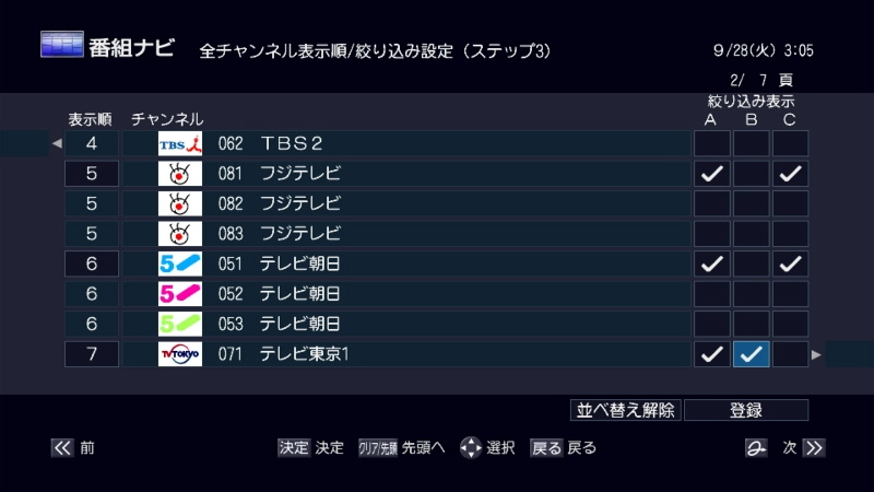 RDユーザーにはお馴染みの、番組表の表示チャンネルカスタマイズ機能。リモコンの4〜6ボタンで絞り込みも可能だ