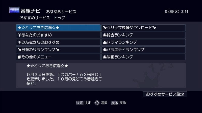 「おすすめサービス」により、全国のRDユーザーによる録画予約ランキングを表示。ドラマ、アニメなどジャンル別の表示でもでき、面白い番組探しになかなか役立つ機能だ