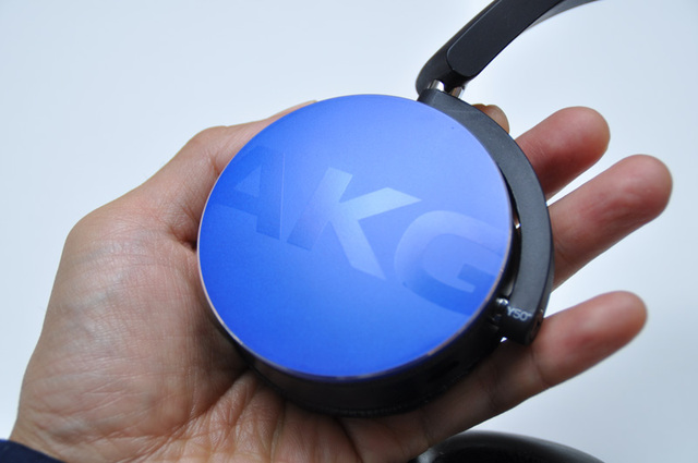 鮮やかなブルーに彩色されたシェル。マット仕上げの表面に、グロス仕上げのブランドロゴを配置している。AKG独自の正円形のイヤーカップも特徴
