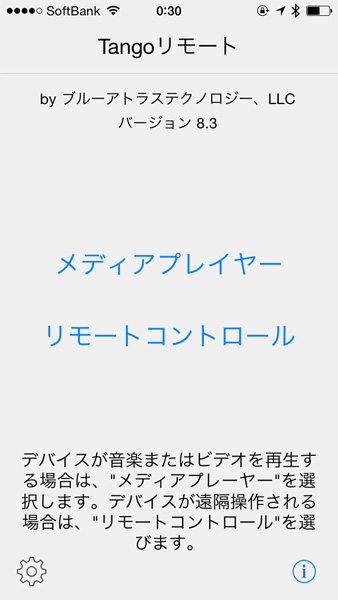 Tangoリモートを起動。「リモートコントロール」を選ぶとマスターに、「メディアプレーヤー」を選ぶとスレーブになる