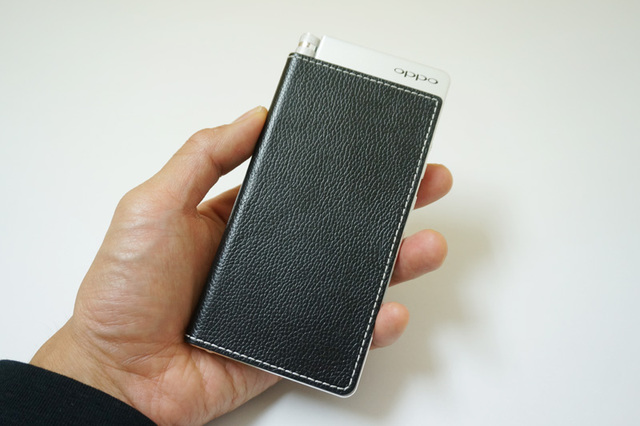 OPPO初のハイレゾ対応ポータブルヘッドホンアンプ「HA-2」はスマートフォンのように軽くて薄い本体。外装はレザーカバー仕上げだ