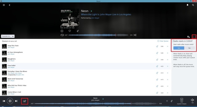 左下赤枠のボタンでプレイリストに切替が可能。右中段赤枠のボタンでレコメンド曲の連続再生のオン/オフが選べる