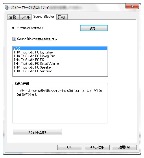 ピュアオーディオ機器として使う場合には、スピーカーのプロパティでオーディオ効果を無効にしよう