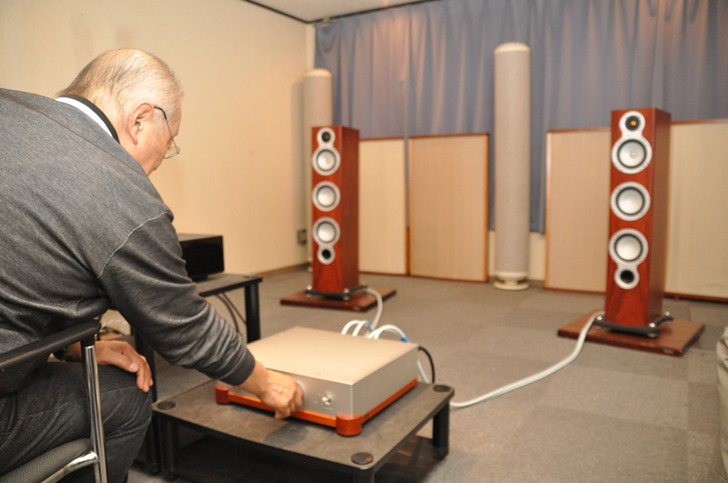 音元出版 オーディオ試聴室でRSA-F1のサウンドを確かめる斎藤氏