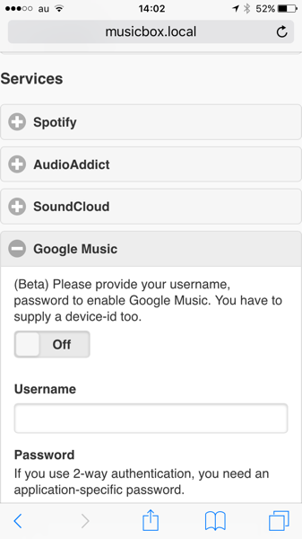 「Pi MusicBox」にWEBブラウザ(iPhone)からアクセスしたところ。Google Play MusicやSpotify PremiumのユーザIDを登録しておくことができる