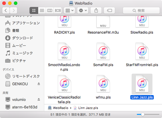 Volumioの共有領域をPCにマウントし、「WEBRADIO」フォルダにプレイリストファイルをコピーすれば、WEBラジオ局を追加できる