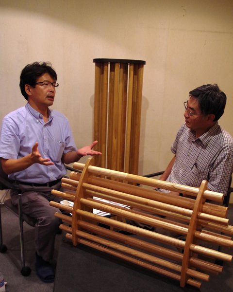 日本音響エンジニアリング(株)の山下さん(写真左)に、同社のルームチューニング機構であるAGS(Acoustic Grove System)について解説を受ける筆者(写真右)
