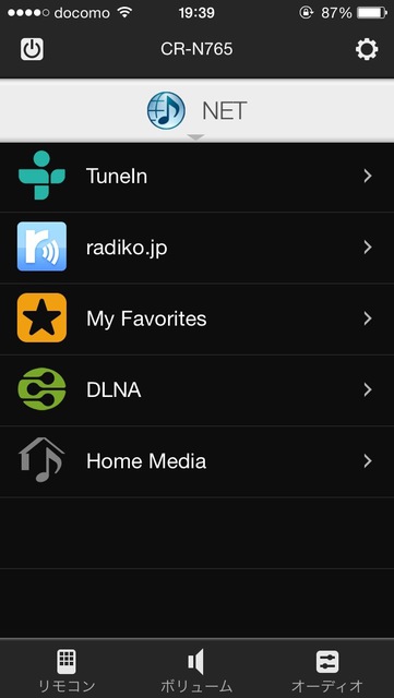 「ONKYO Remote 3」の画面。まずは入力選択から「DLNA」を選ぶ
