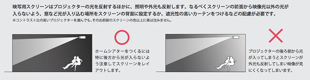 プロジェクターとスクリーンの設置に関しては、プロジェクターの後方から光が入らないように注意する必要がある(※OSスクリーンの公式サイトより)