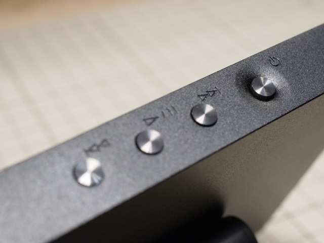 DP-X1の基本ボタン周りの処理。ボタンは小さめ。電源ボタンのみ周囲を滑らかに窪ませてある
