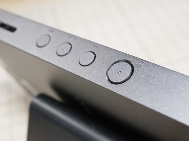 XDP-100Rの基本ボタン周りの処理。少し大きめのボタンで、電源ボタンは少しだけ凹ませて設置