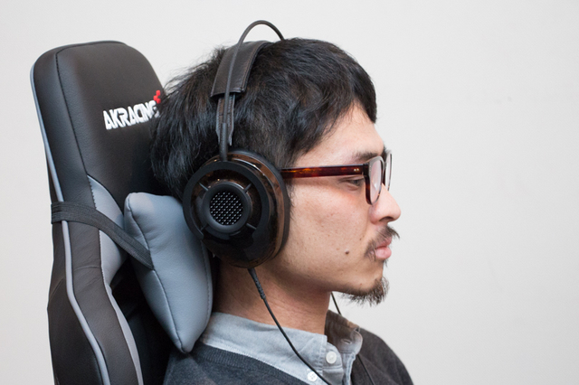 小型のヘッドレストが適度に沈み、ヘッドホンのハウジングが椅子にあたることなく、かつリラックスした姿勢が保てる。取り付けゴムが伸縮するので、ヘッドレストの位置も微調整できた