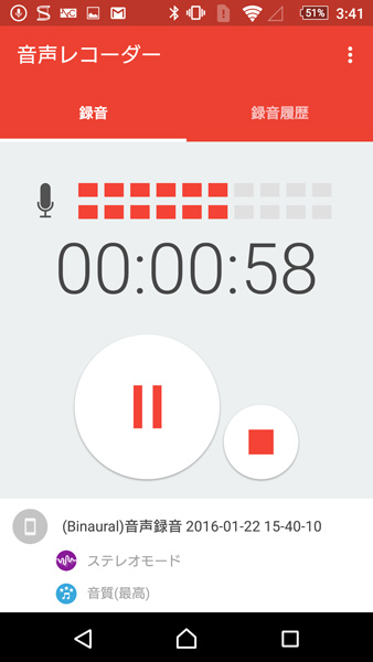 バイノーラル録音に対応する「音声レコーダー」アプリで録音中