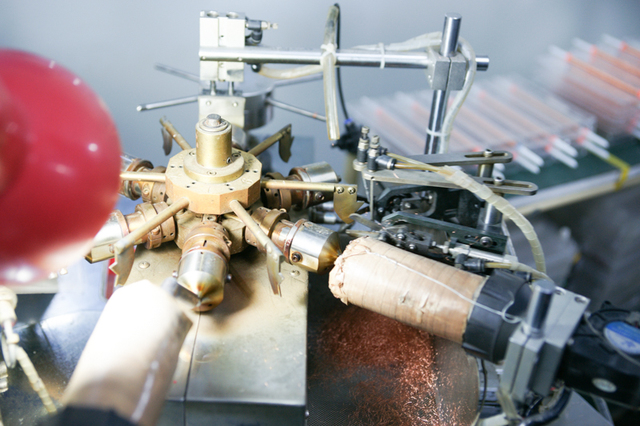 左写真はボイスコイル自動製造機。0.5秒以内に1個以上のペースで巻き上げる。右写真は巻き上がったボイスコイル