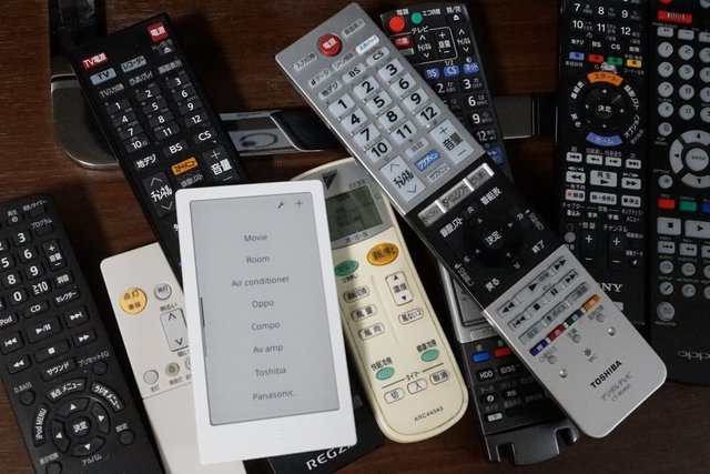 検証した製品のリモコンと「HUIS REMOTE CONTROLLER」。これだけでの数の(やろうと思えばさらに多くの)リモコンを1台に集約できる