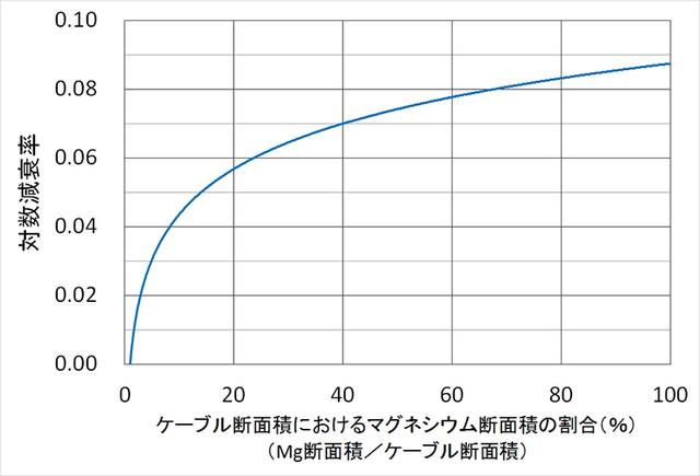 <図B>横軸は銅とマグネシウムの割合、縦軸は振動減衰率を表し、上に行くほど制振効果が高い。特に、5~20%程度のマグネシウムの割合で立ち上がりが早く大きな効果が期待できる