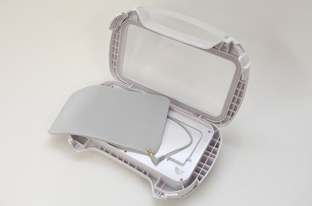 本体をパカッと開けて、iPhoneにステレオミニジャックを挿し込むしくみ