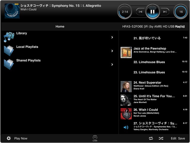 USB-DACから再生を行っている際の「Kinsky」の画面。再生プレーヤーを示す欄には「HFAS1-S10[ iFI(by AMR)]」の文字が表示