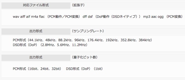 USB-DAC接続によるネットワーク再生の対応ファイル形式、および対応サンプリング/ビットレート(アイ・オー・データの公式サイトより)