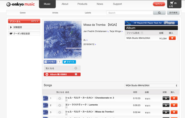 e-onkyo musicでは作品詳細のページにタイトルやファイル形式の説明に「MQA」の記載を入れて、通常のMQA非対応の音源との区別をわかりやすくしている