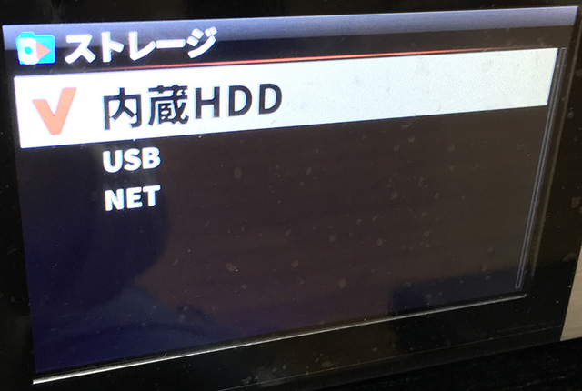 Music DB用のストレージは、内蔵HDD、USB-HDD、ネットワーク上のNASやPC(NET)から選択できる