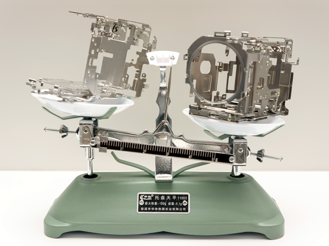 天秤の右側に乗っているのが先代機「FDR-AXP35」に搭載されたボディ内フレーム、左側に乗っているのがAX55に搭載されるボディ内フレーム。ボディ内フレームは主に放熱とボディの強度を保つためのパーツだが、AX55では構成パーツを一から見直し徹底して無駄を省くことで、AXP35と変わらない放熱性、強度を保ちながらも大幅な軽量化を達成している